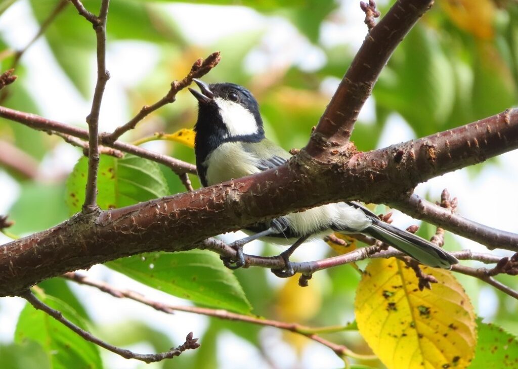 落葉の始まった桜の木では、シジュウカラが飛び回ります。