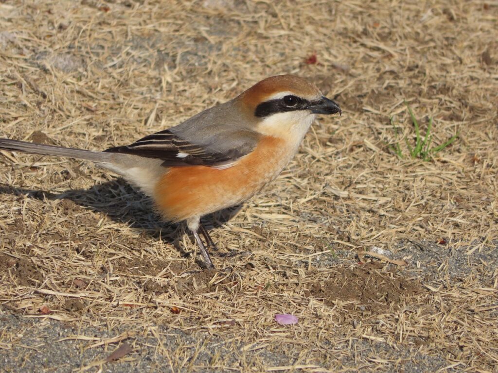 芝生グラウンドで草をむしっていると、モズが来ました。これまた近い。