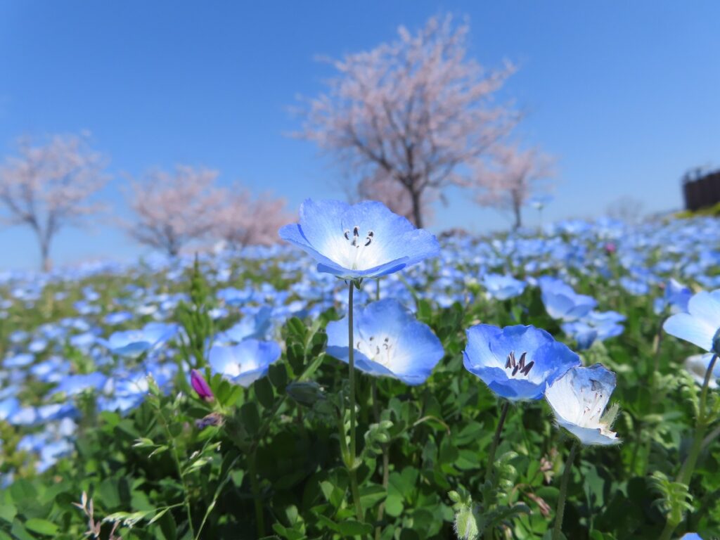 ソメイヨシノの桃色とネモフィラの鮮やかな青がたまりません。