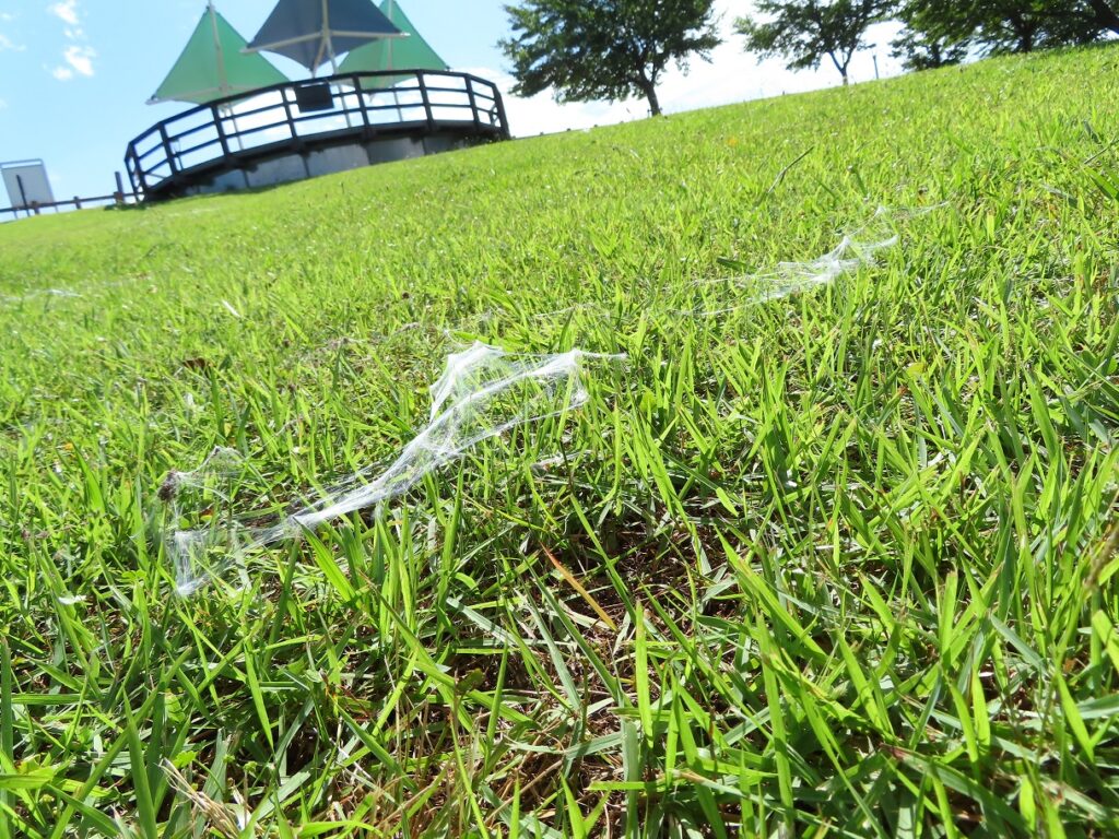別の日、修景池に謎の糸が!不織布みたいだなあ。