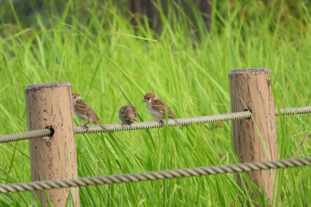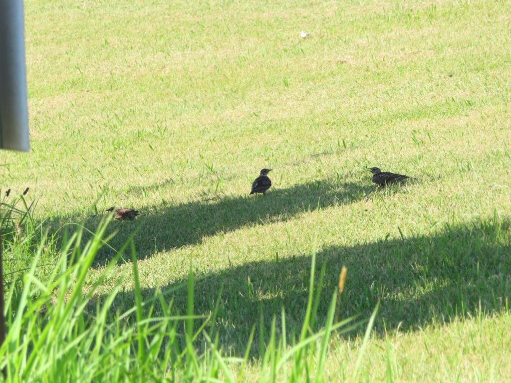 あまりの暑さに日かげを活用するヒバリたち。ふー、ごくらく極楽。