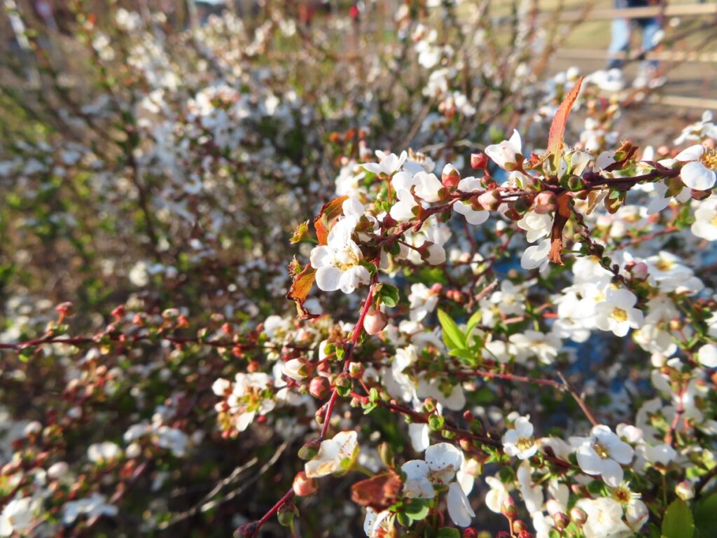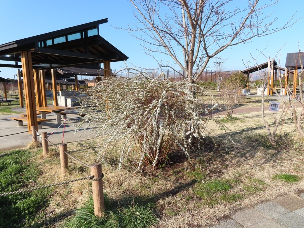 駐輪場やバーベキュー広場では、ユキヤナギが咲き始めました。