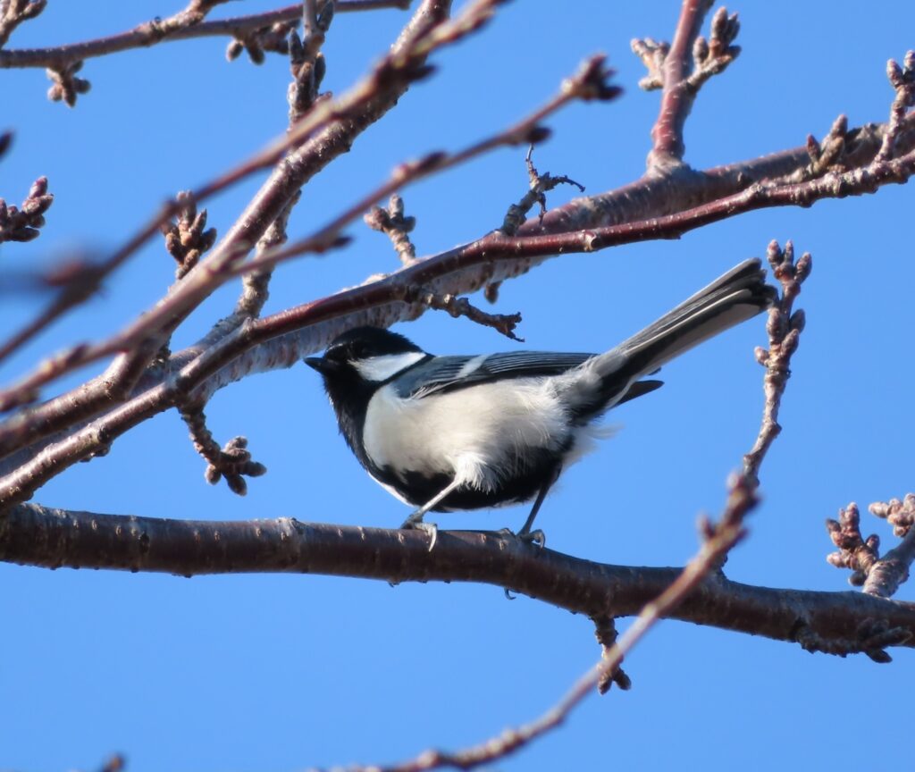 ソメイヨシノの間を飛んで、落ち着きなくさえずります。