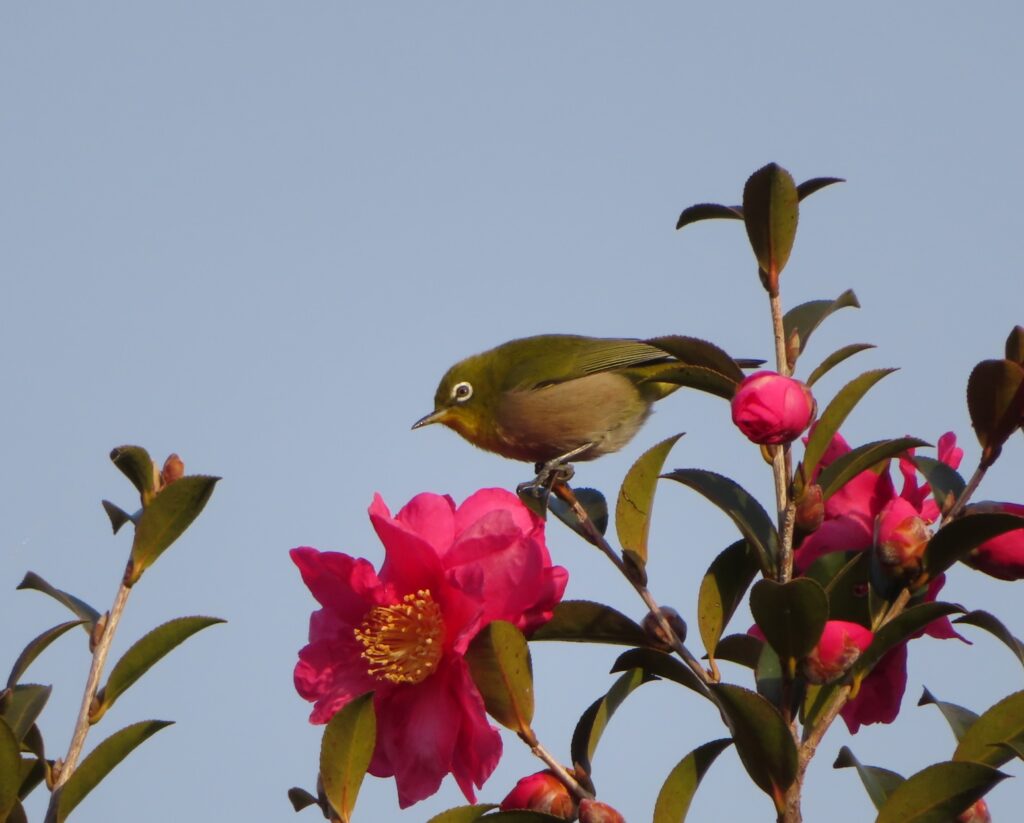 サザンカには、メジロがよく蜜を吸いにやってきます。