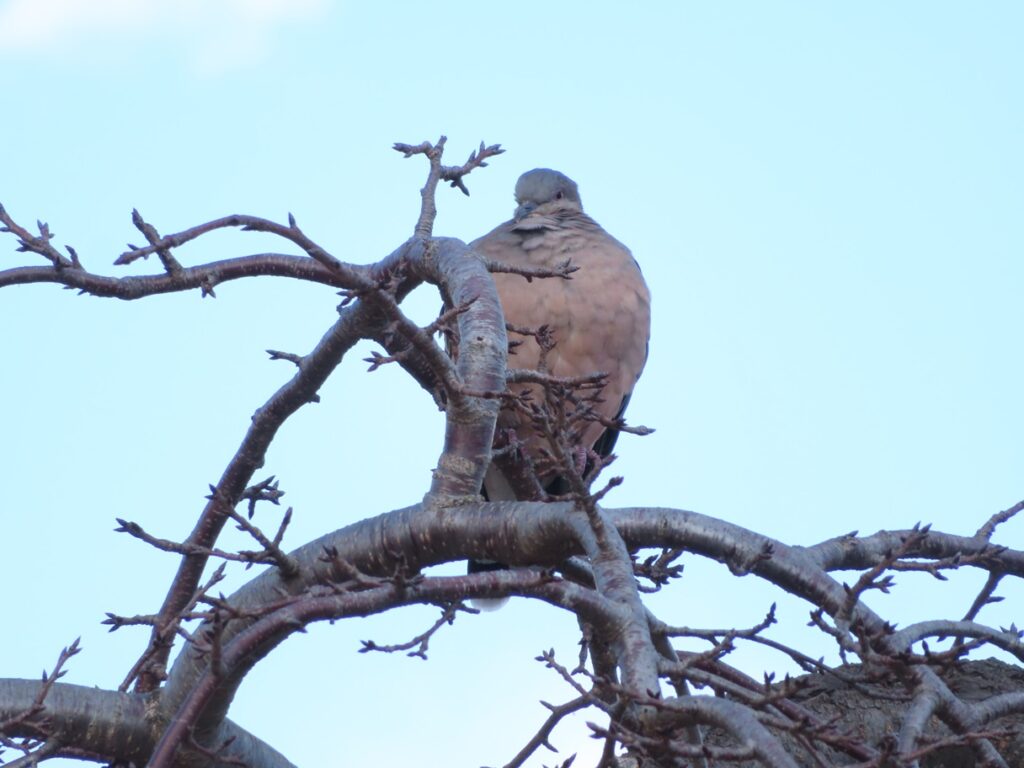 上の方だけ見えます。ひょっこり。中央右に写る飛行物体は、拡大して確認した所、キジバトでした