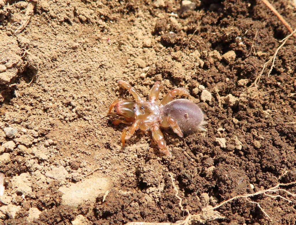 このクモは土の中に筒状の巣をつくる、古いタイプのクモです。