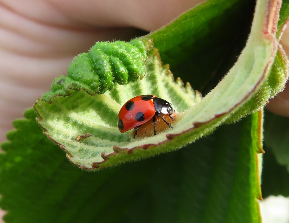 抱えているのは、テントウムシに寄生していたハチのマユで、