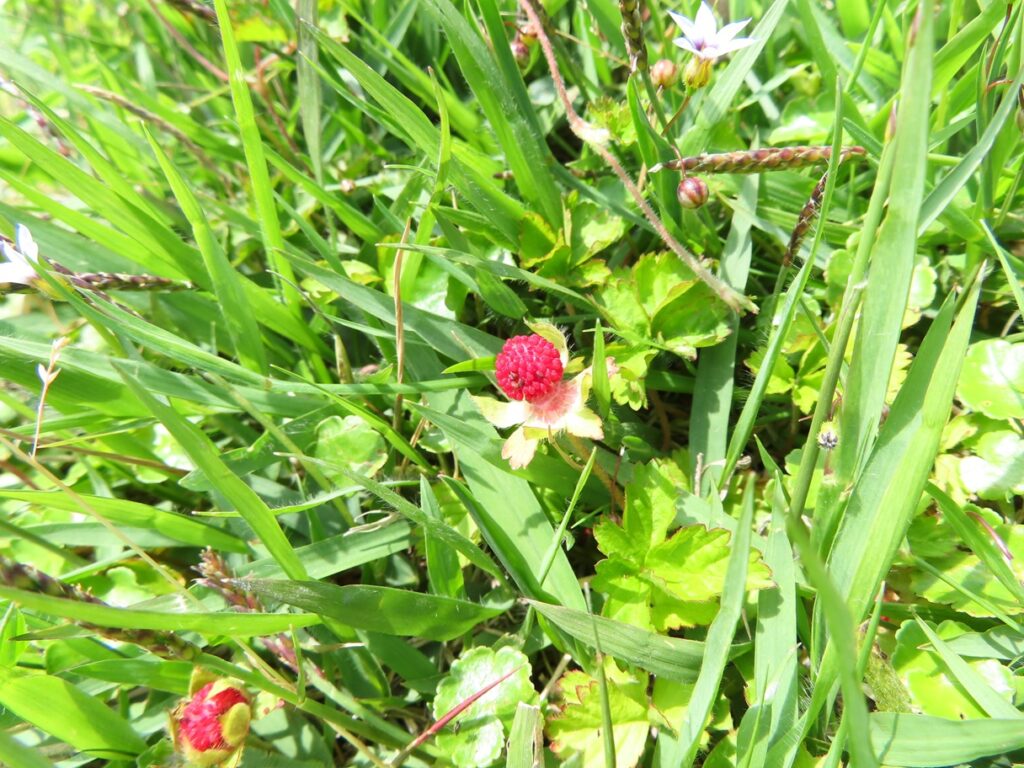 草をかき分けると赤い果実が。ヘビイチゴです。