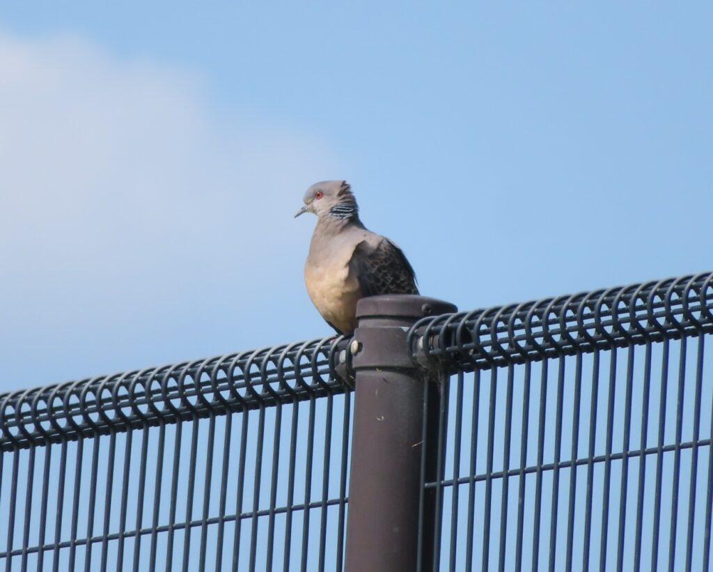 グラウンドのフェンスではキジバトが風に耐えていました。