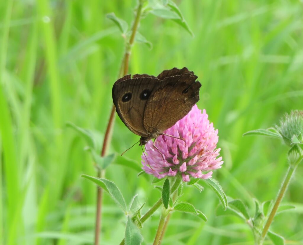 目玉模様があるのはジャノメチョウ。必死にミツを吸い中。