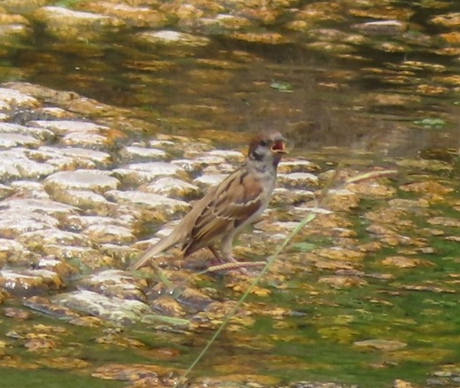 修景池の上流で見つけたスズメも、ハァハァしていました。