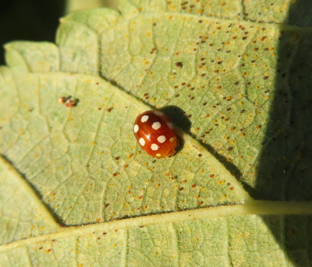メルヘンな虫が歩いていました。シロホシテントウと申します。