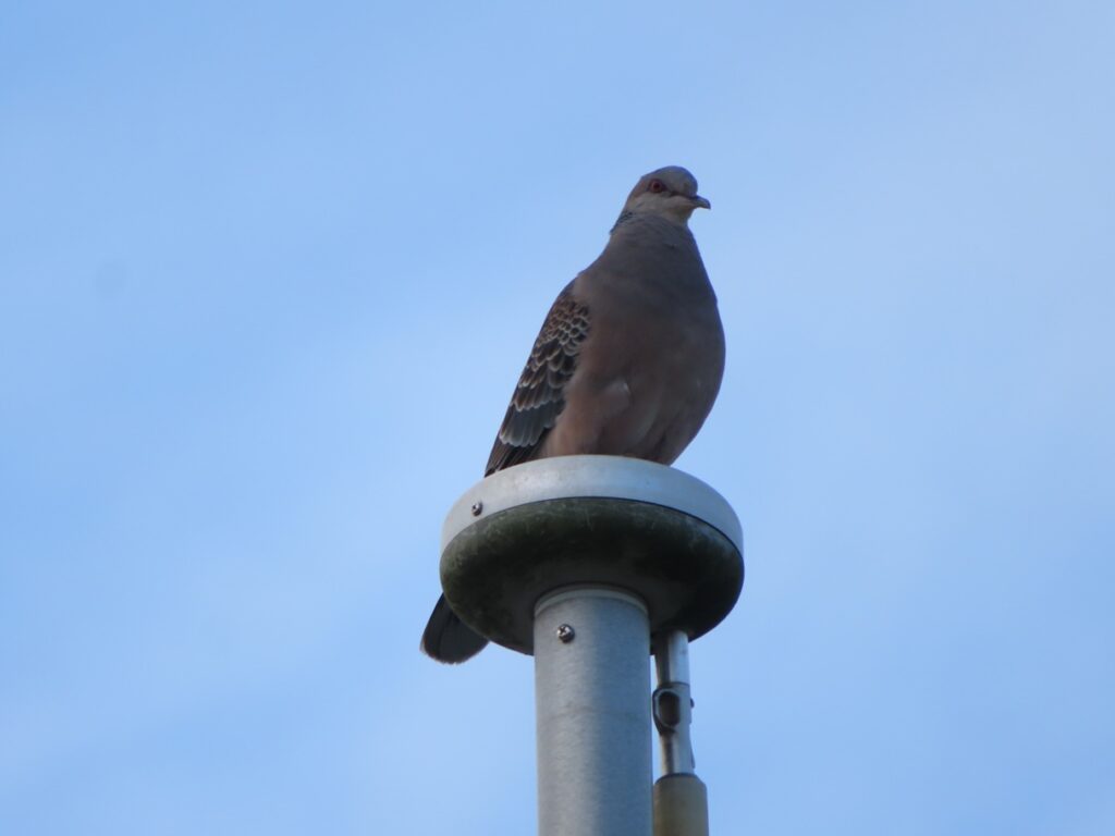 旗ポール(旗をかけるアレ)を見上げると、キジバトが鳴いていました。デデーポポー。