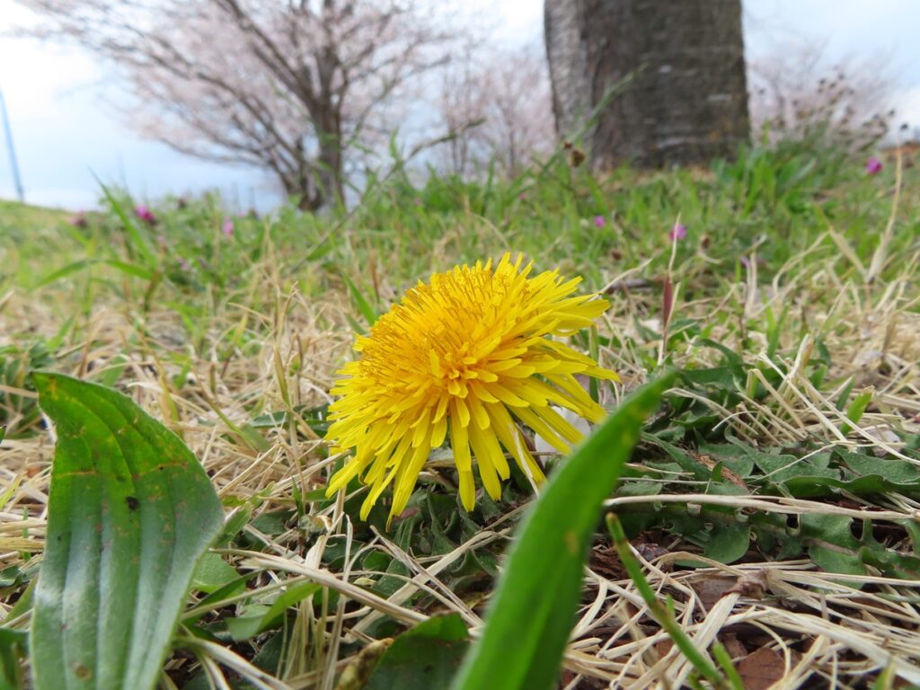 ソメイヨシノの根元では、タンポポが見上げていました。