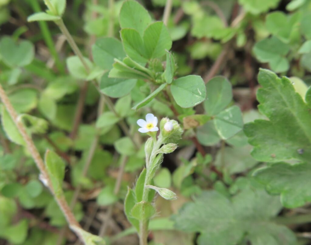 小さい青色の花はキュウリグサ。