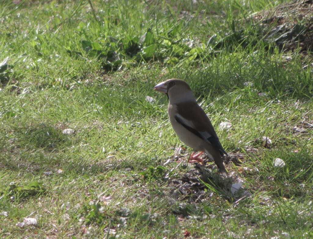 冬の渡り鳥と聞くシメが、桜の花びらを眺めていました。まだいたのか。