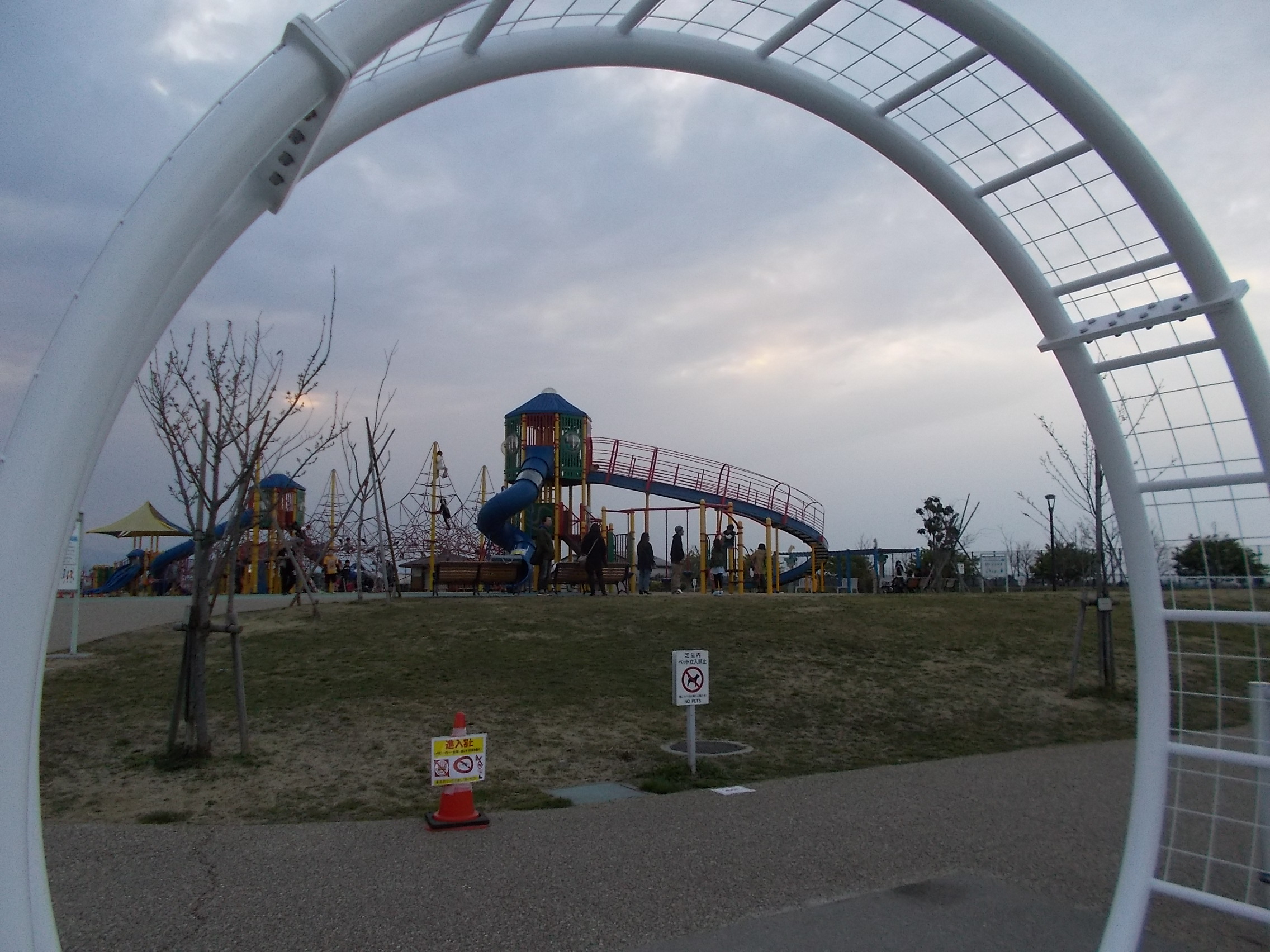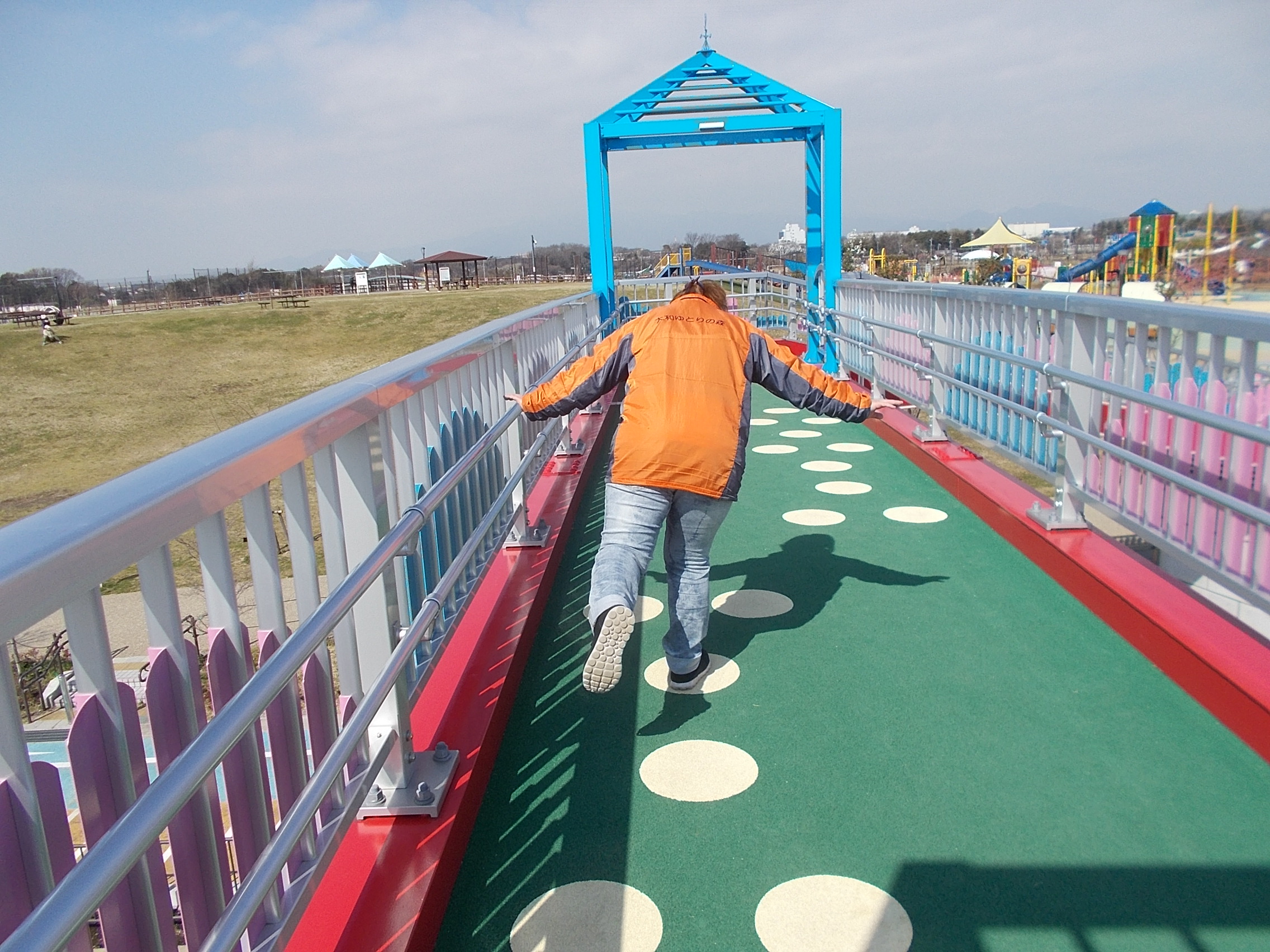 「オモチャの橋」レポート4 あの○はなんと昔なつかし「ケンケンパ」のしるしでした。 早速スタッフもやってみました。 公園側の階段を下りると目の前はわんぱく広場です。 皆様も東側に駐車場(東側)に止めた際はぜひご利用ください。