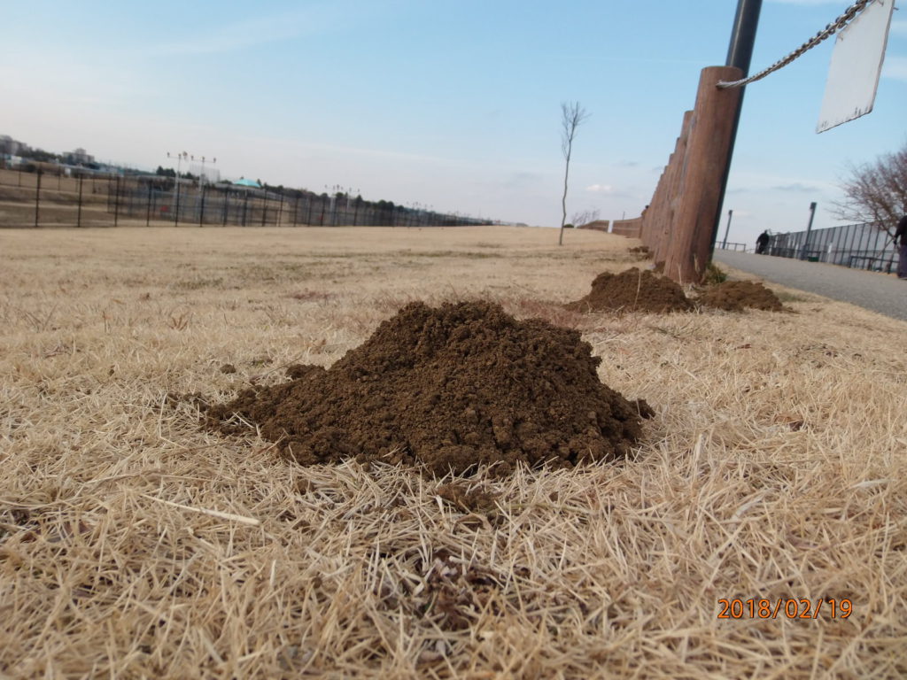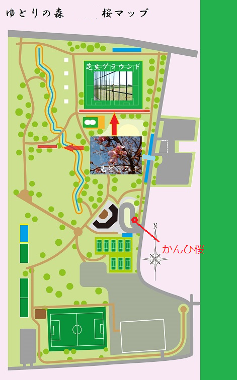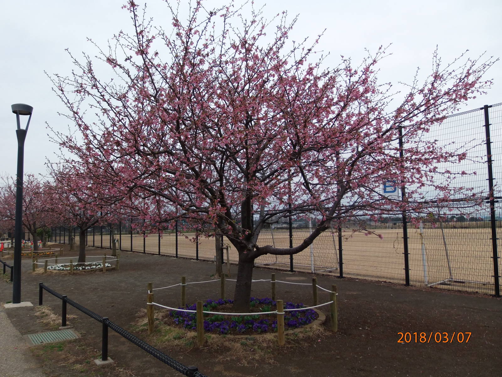 河津桜は芝生グラウンドの南側に並んで咲いております。