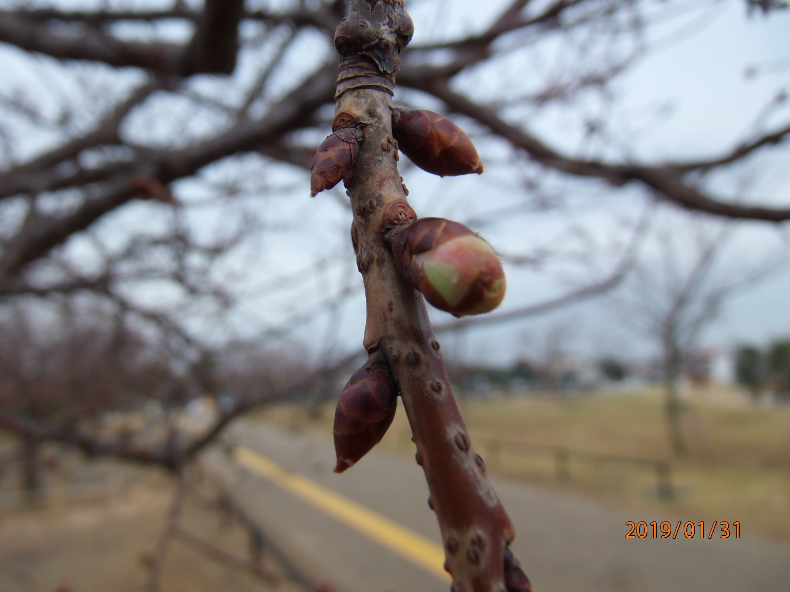芝生グラウンド前の「河津桜」のつぼみを観察していたところ、ちょっぴり変化がありました。
