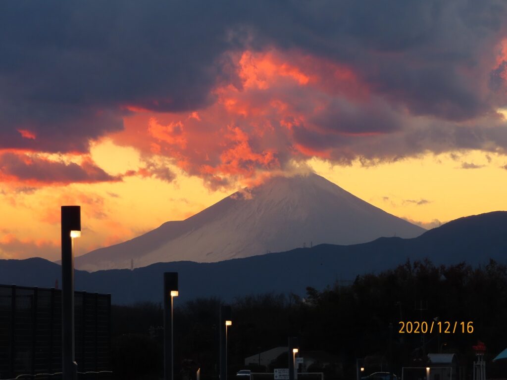 富士山にかかる雲が、まるで火を噴くようにあかく照らし出されていました。