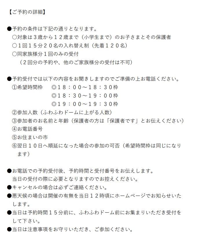 このイベントでは特別に3歳~12歳(小学生まで)のお子様&保護者の方もふわふわドームに上がれます♪