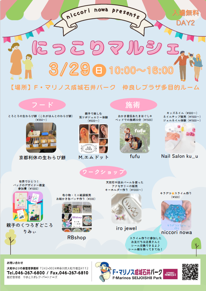キーホルダ作りなどのワークショップ、わらび餅や焼き菓子のフード販売、キッズネイルや頭ほぐしなどの施術などを予定しています!