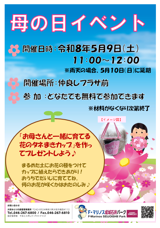 5月9日(土)母の日イベント 「お母さんと一緒に育てる花のタネまきカップ」 を作ってプレゼントしませんか? まるめた土にお花の種をつけて、カップに植えたら出来上がり! 何のお花が咲くかは、育ててからのお楽しみ♪ 日時: 令和8年5月9日(土) 11:00~12:00 ※雨天の場合、5月10日(日)へ延期 場所: 仲良しプラザ前 対象: どなたでも無料でご参加いただけます ※ 材料がなくなり次第終了とさせていただきます。