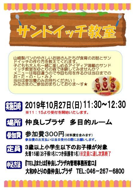 10月27日(日)サンドイッチ教室イベント開催 山崎製パンのお姉さんたちが楽しい食育のお話を交えて サンドイッチの作り方を教えてくれる“サンドイッチ教室”を 今年も開催いたします! 参加費のみお持ちいただければOKです(*^^)v お持ち帰りのできるかわいいエプロンをつけて、 みんなで楽しくサンドイッチを作りましょう♪ ご希望の方は仲良しプラザ内管理事務所窓口か お電話にてお申込み下さい。 皆様のご参加をお待ちしております<(_ _)>