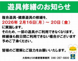 2026年2月16日(月)~20日(金)に、複合遊具・健康遊具の修繕を実施します。