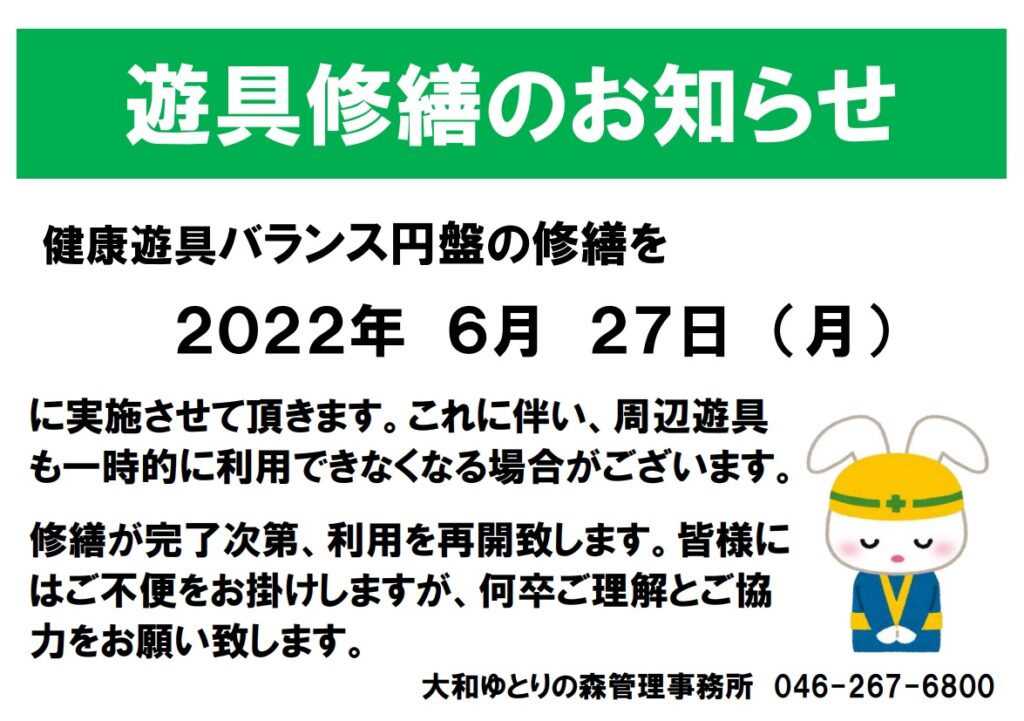 現在、破損の為利用を中止とさせて頂いております健康遊具バランス円盤の修繕を、下記の日程にて実施致します。雨天の場合、6月29日(水)となります。