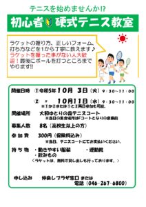 初心者向け硬式テニス教室開催 10月3日(火),11日(水)