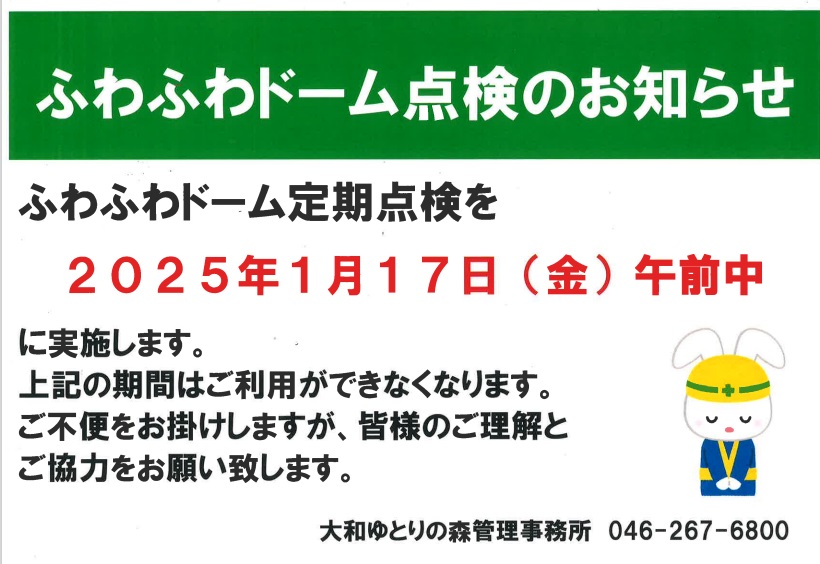 ふわふわドーム点検のお知らせ 2025年1月17日(金)午前中にふわふわドームの定期点検を行います。 点検中はふわふわドームをご利用できませんので予めご了承ください。 点検が完了次第、利用を開始いたします。