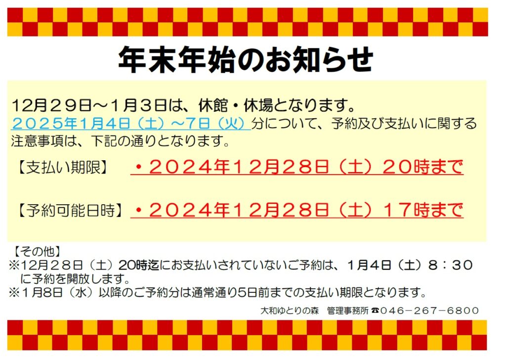 2026年1月4日(日)~7日(水)分について、予約及び支払いに関する注意事項は、下記の通りとなります。