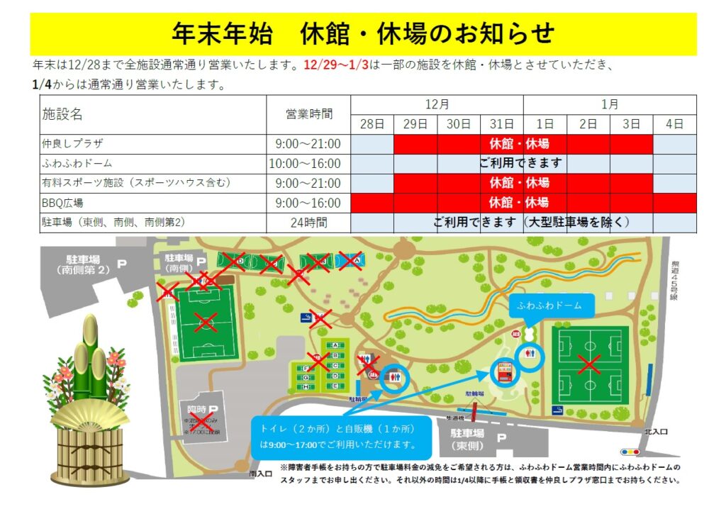 12月29日~1月3日は、下記施設は休館・休場となります。