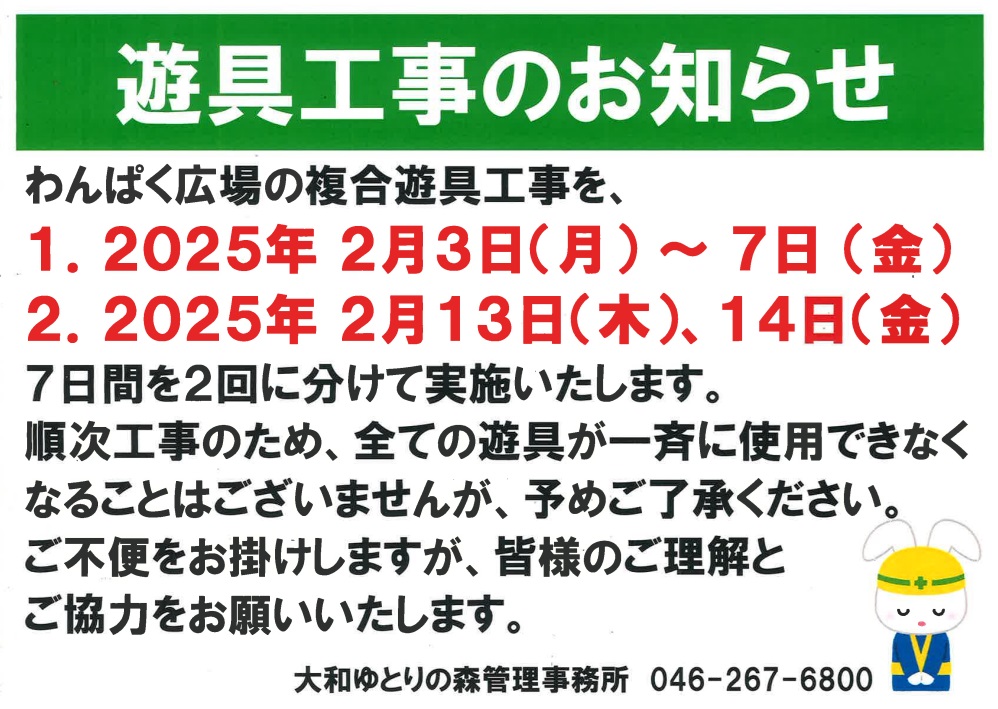 わんぱく広場の複合遊具工事を、下記の日程で実施いたします。