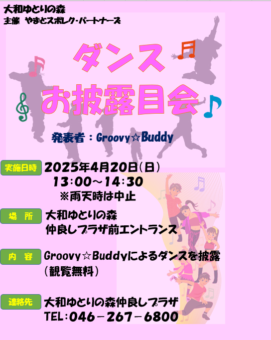 ダンスお披露目会のお知らせ 4月20日(土)13:30~14:30にかけて 仲良しプラザ前にて、子どもたちによるダンスお披露目会を行います。 観覧無料です☆ 皆様のお越しをお待ちしています! ※雨天時は中止となります。
