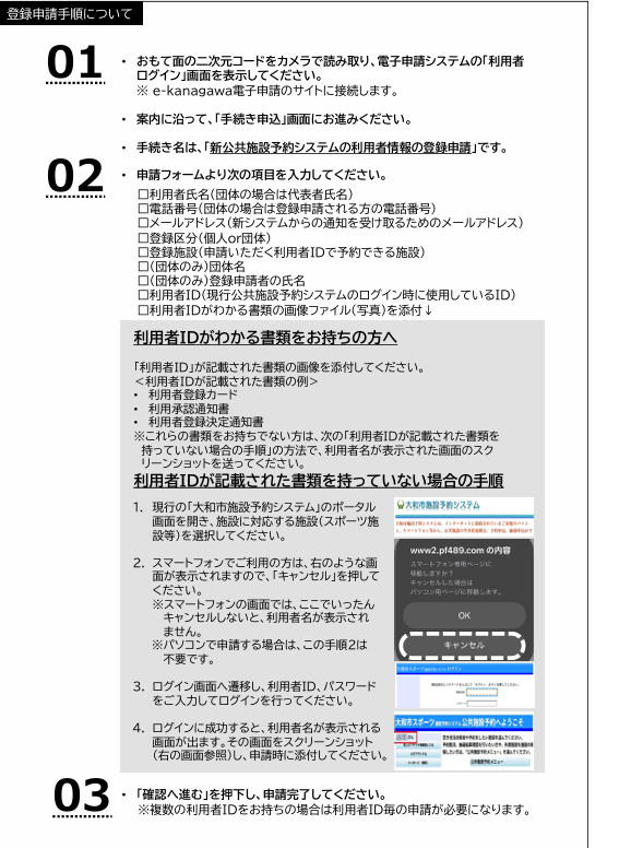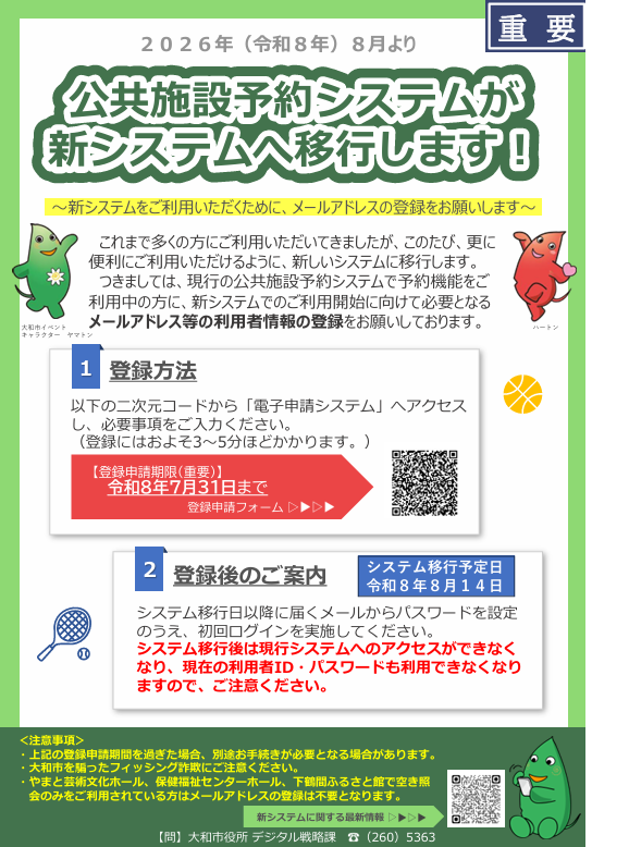 現行の公共施設予約システムをご利用いただいている方は、システム移行後の新システムの利用に向けて必要となるメールアドレス等の利用者情報の登録申請をお願いいたします。