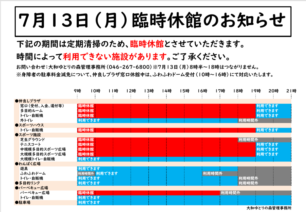 7月13日(月)は定期清掃のため臨時休館とさせていただきます。