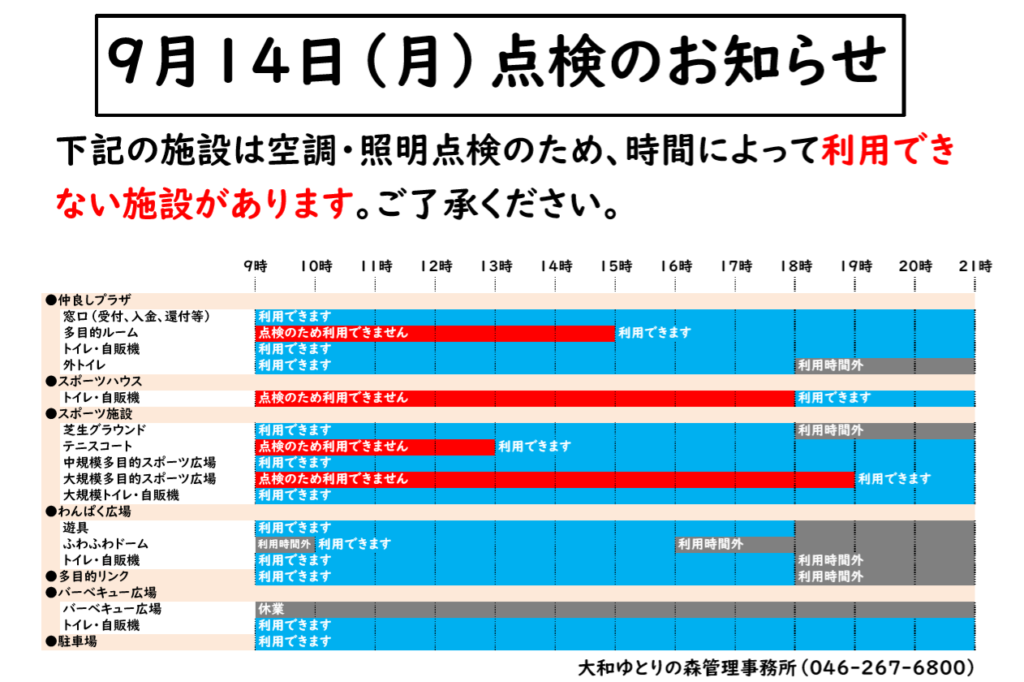 9月14日 定期点検のお知らせ 9月14日(月)は定期点検のため、時間によってご利用頂けない施設がございます。ご了承ください。 詳細は図をご覧ください。 お問い合わせ:大和ゆとりの森管理事務所(046-267-6800)