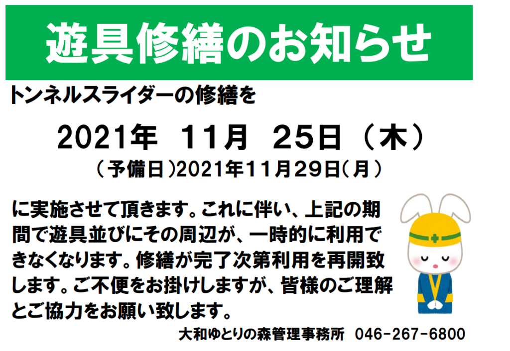 わんぱく広場トンネルスライダー修繕のお知らせ わんぱく広場トンネルスライダーの修繕を、2021年11月25日(予備日29日)に実施致します。 予めご了承下さいますようお願い致します。皆様のご理解とご協力をお願い致します。